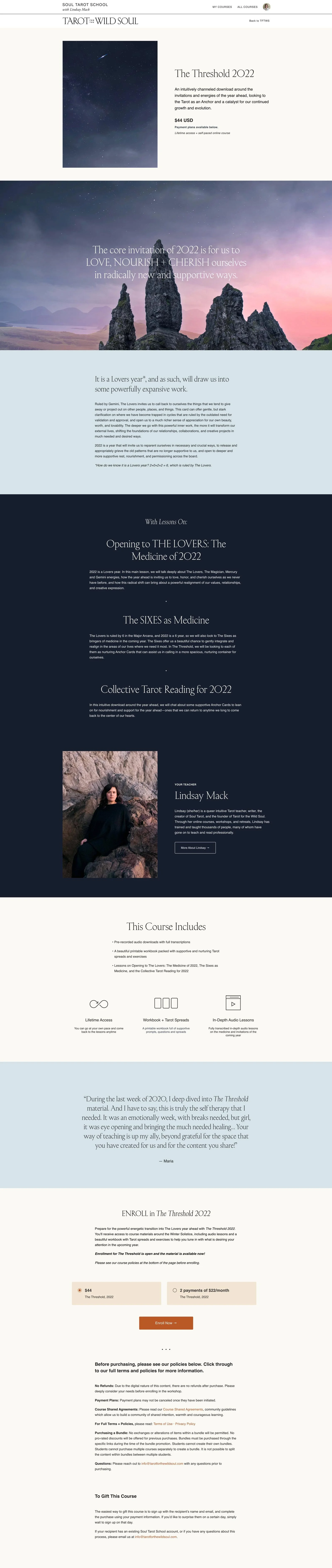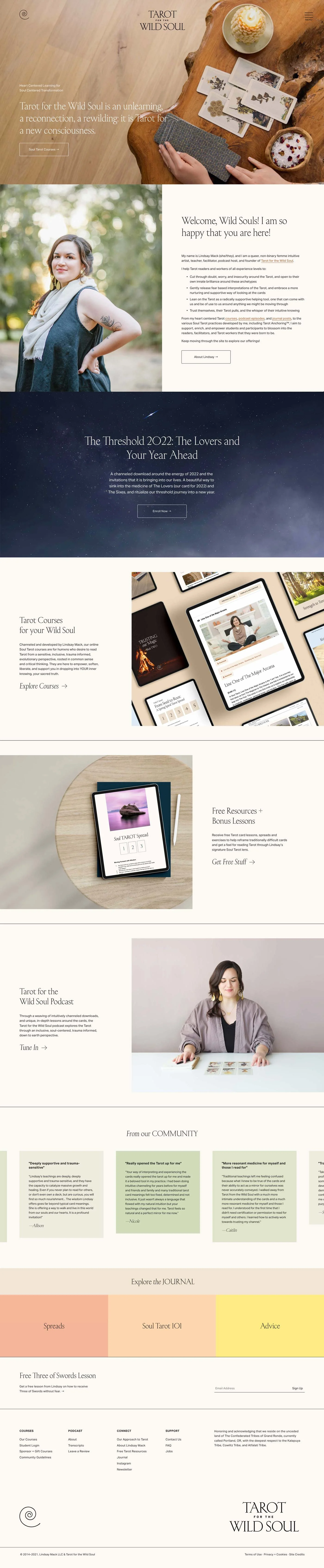 Tarot for the Wild Soul was looking to rebrand and develop a new digital experience for their many offerings—award-winning courses, an industry-beloved podcast, free Tarot education and more. Positioning Lindsay as an established leader in her industry, I rebranded and relaunched the Tarot for the Wild Soul site as the home for all of Lindsay’s Tarot education. Combined with detailed customization of their Teachable school, I developed a fully branded, seamless, high value educational experience for their students.